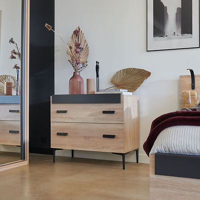 Pensée pour concilier accessibilité et qualité, cette collection offre des meubles solides : panneaux de particules mélaminés (épaisseur 19 mm), assemblages fiables et finitions soignées. Vous bénéficiez ainsi d’un mobilier durable qui s’aligne avec un budget maîtrisé.