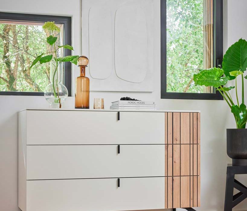 Fabriquée en France avec un souci de qualité, cette collection mise sur des panneaux mélaminés robustes, des tiroirs équipés de glissières à billes et fermeture amortie, ainsi que des assemblages par vis de rappel et tourillons bois — autant de détails qui garantissent solidité et durabilité au fil des ans.