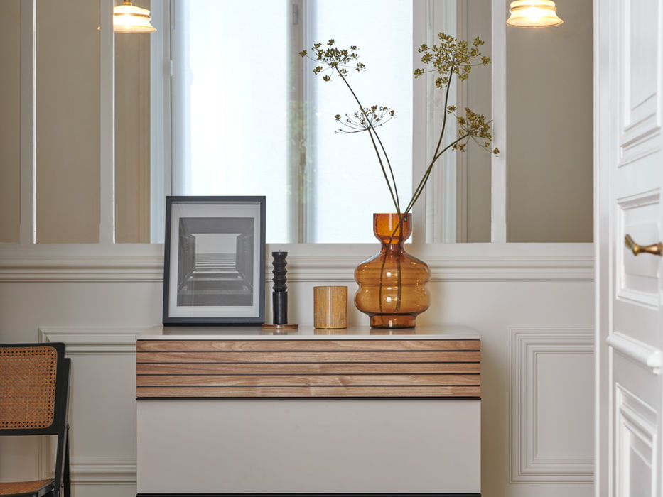 Pensée pour durer, chaque meuble est fabriqué en France avec des panneaux de particules mélaminés épaisseur 19 à 30 mm, des fonds montés en rainure et des assemblages tourillons bois + vis de rappel : tous les détails sont conçus pour allier esthétique et robustesse.