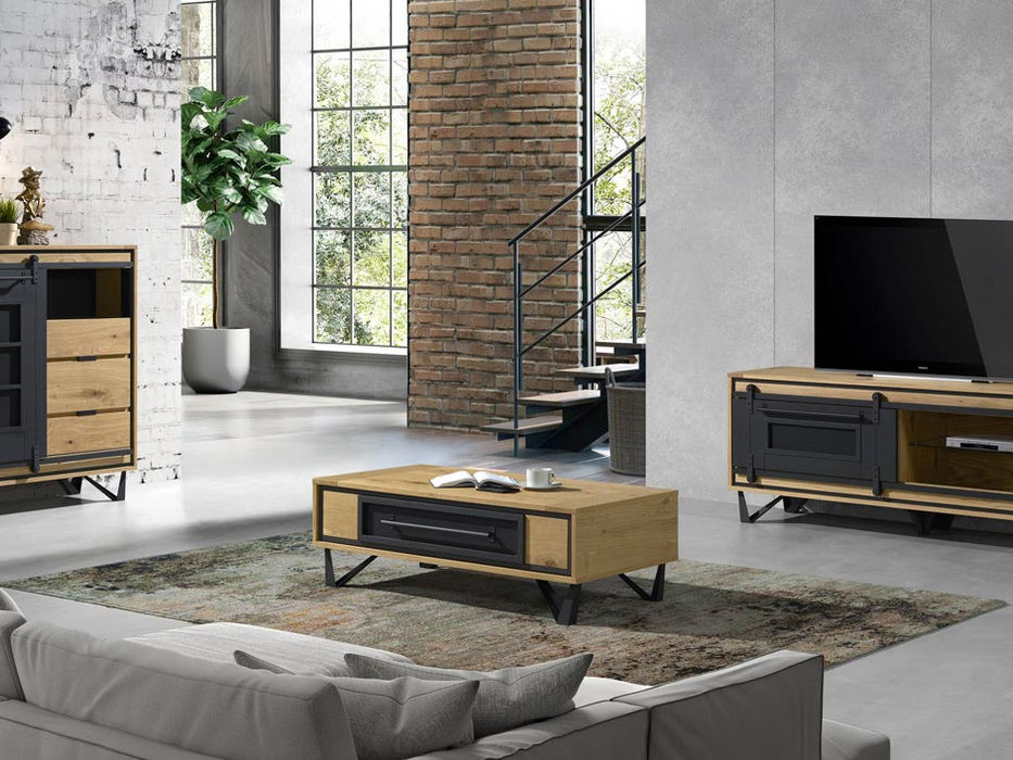 Fonctionnelle et modulable, la collection SUNSET propose buffets, tables, meubles TV, vitrines et chaises assorties — tous déclinés dans des dimensions variées et finitions « ton brut brossé ».
