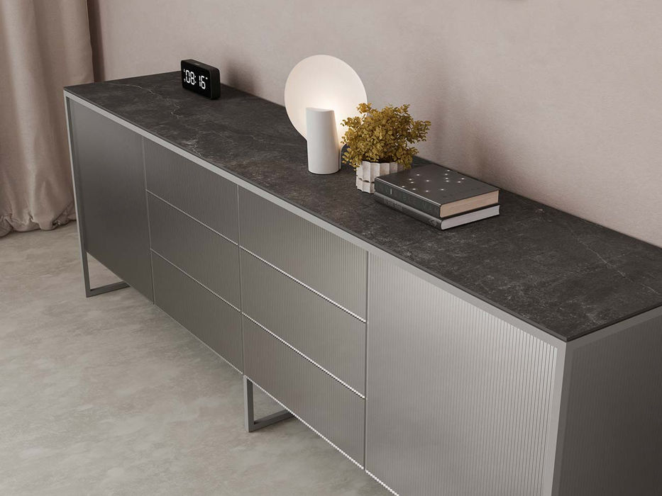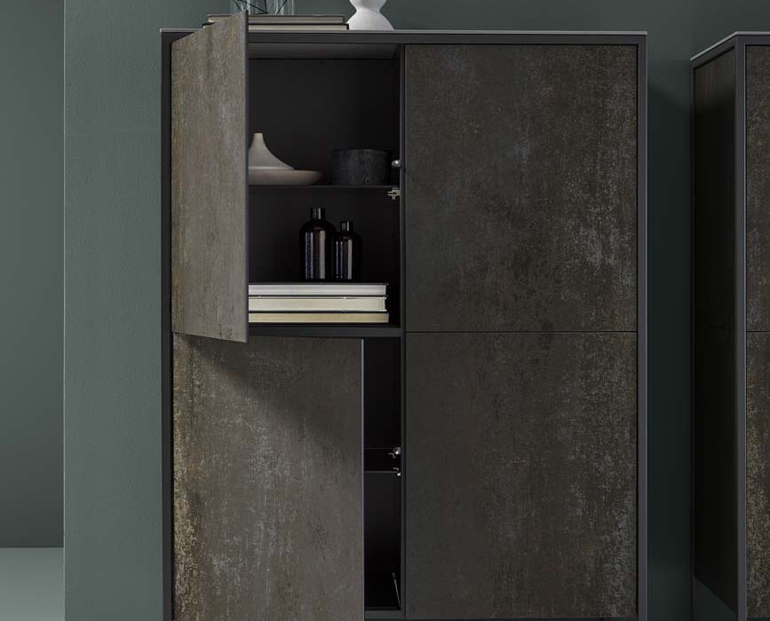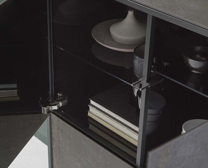 La finition joue un rôle clé : choix entre céramique, bois ou verre strié pour les façades et plateaux, verre disponible en plusieurs coloris, qui vient dynamiser l’ensemble et souligner la qualité de fabrication. Les détails techniques — structures métalliques, charnières amorties, ouverture « push » — assurent un usage fluide et durable.