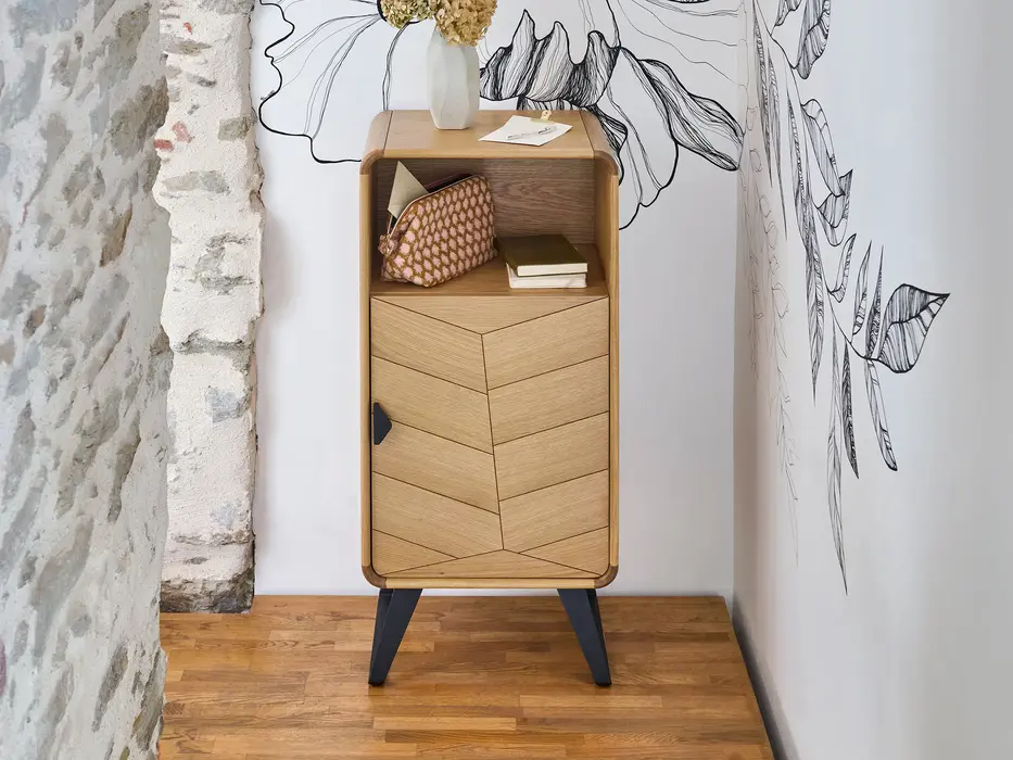 La collection Tokyo met le bois au premier plan, avec un motif chevron affirmé qui donne immédiatement du caractère à chaque meuble. Ici, le décor n’est pas un détail : il structure les façades et capte le regard, tout en conservant une grande sobriété dans les lignes.
